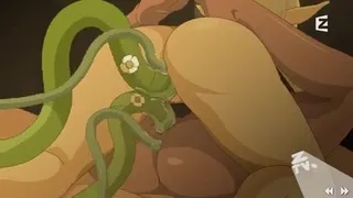 Cartoon elves are having sex with each other and with a monster with huge tentacles