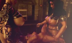 Two shapely girls with big tits fuck a tiny girl with huge cocks