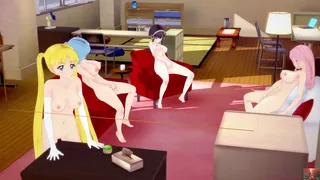 Description: With voices echoing far and wide, 女の子たち (onna no ko-tachi) run their hands over their bodies, drowning in heated desire. 甘い声 (amai koe) fills the room, signaling the beginning of an unforgettable night…